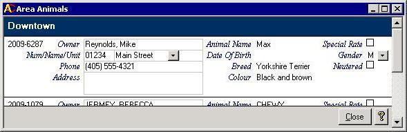 To use this form, you must decide if you want the report for a single street, or all streets within a chosen area. The example above shows the downtown area being chosen. Clicking the Print button will cause the Location Report to be printed listing all animals by street that live in the Downtown area. The example below will allow you to print the same report, except only the animals from Main Street will be included. The box underneath indicates that Main Street is within the Downtown area.