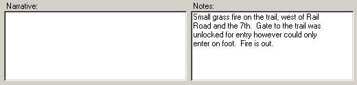 Any hazardous materials that were involved in the incident can be listed here. There is also a section for Equipment which can be used for inventory tracking. The equipment section can show where and how much of each equipment was used. Finally the Personnel section at the bottom of the form should be used to indicate personnel who were exposed to the hazardous material. NarrativeThis tab contains both the Narrative and a Notes field. A sample picture of these fields is in the picture below.