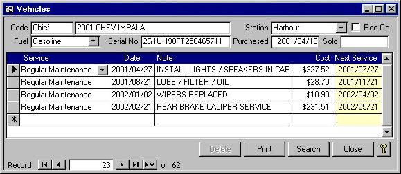 This form also allows access to the vehicle report . This report contains all of the vehicle's information in a clean, printable report. Since the vehicle form shows a limited number of lines in the Service section, the vehicle report will let you see more at one time.