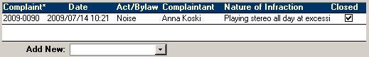 The picture on the right shows the contents of this tab. This is a list of Bylaw complaints that have been received then assigned to this file